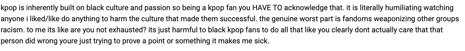 The Washington Post found that although half of the people shot and killed by police are white, black Americans are shot at a disproportionate rate. They account for less than 13 percent of the U.S. population, but are killed by police at more than twice the rate of white Americans. Racism is real. Appropriating and mocking black culture is incredibly harmful. It's important to read about the black experience, listen to what black people have to say, educate ourselves about it and understand how we can make the situation better. Esquire put together a reading list of 20 of the Most Essential books on Black History. It feels like the cultural appropriation in K-pop isn't going away anytime soon, and neither is colourism. It's so engrained into the culture. It's mostly K-pop fans in the West who point out the problems with the styling of idols. I have seen people suggesting that K-pop entertainment companies employ more staff outside of South Korea to improve diversity and awareness of different cultures, or educate idols on what is acceptable and what's not. Going back to Sherliza's video, she said: "Be mindful of unequal and unfair treatment from and by anyone...but don't be militant about it". This was very well said. If we can't have a civil conversation, progress won't be made.