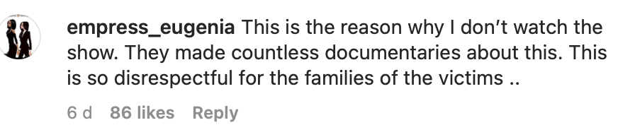 It's important to tell certain stories but there is a fine line between respectful reporting of real life events on the news, and docudramas which dramatise real, harrowing events and present it to millions of viewers for entertainment. I think the question we all need to ask ourselves is, if something were to happen to our family member or friend, would we want it to be turned into a 10-part series about how their life was ended, glorifying the person that was responsible for their death? It's clear that shows like this are intended for entertainment, not for educational purposes.